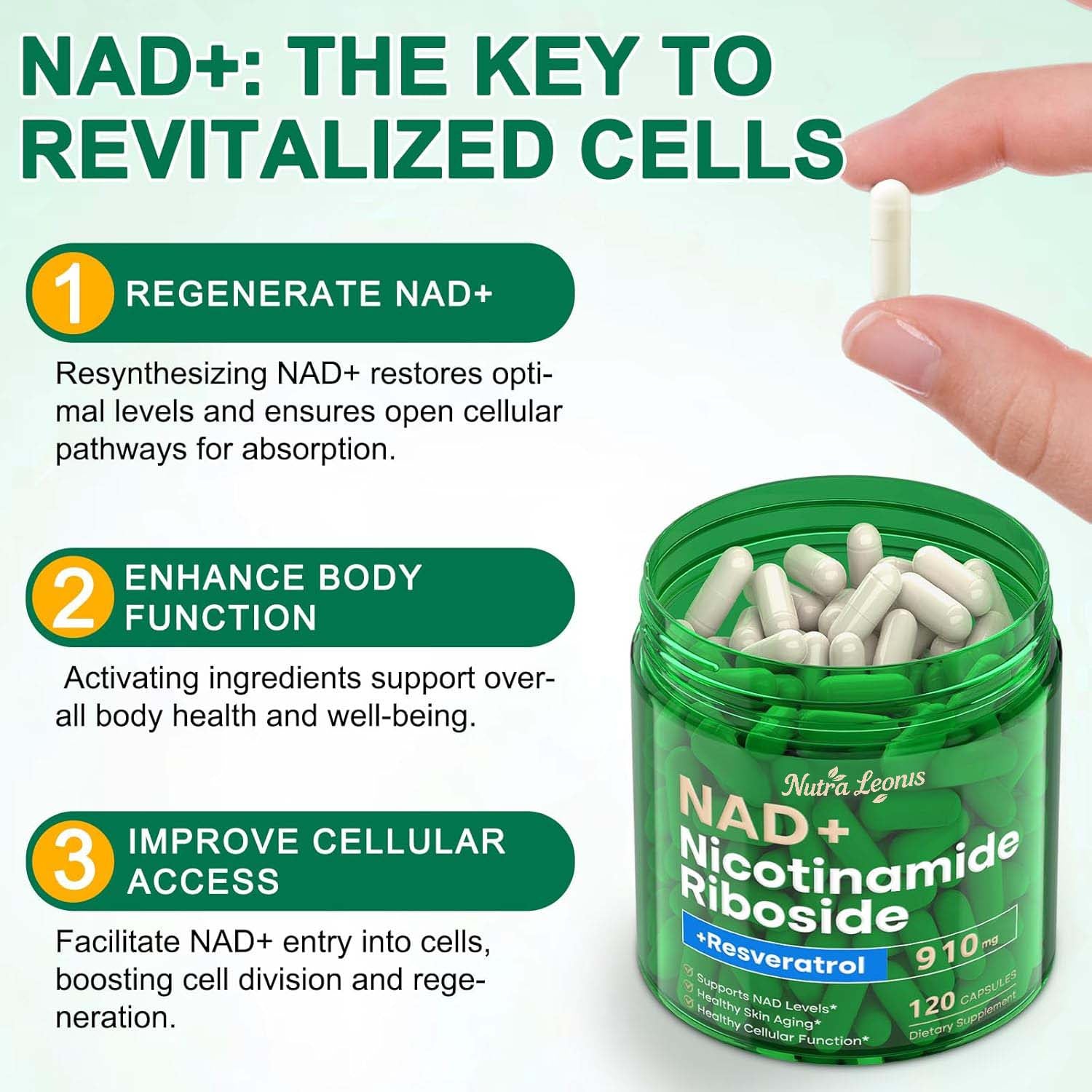 NUTRALEONIS NAD Supplement, NAD Nicotinamide Riboside 910 Mg for Men and Women, Liposomal Nicotinamide Riboside Resveratrol, for Anti-Aging, Energy, Focus, Boost NAD+ - 120 Capsules